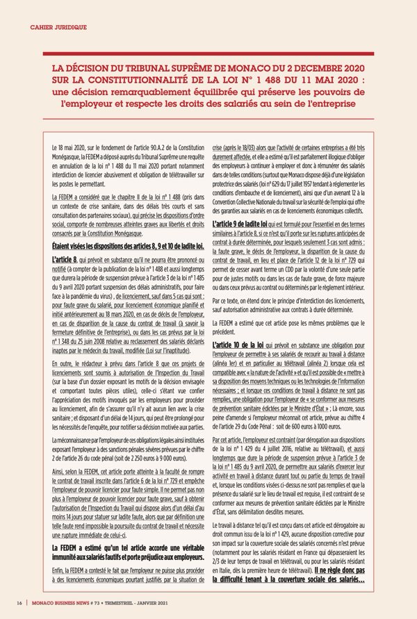 La décision du Tribunal Suprême de Monaco du 2 décembre 2020 sur la constitutionnalité de la Loi n° 1 488 du 11 mai 2020 : une décision remarquablement équilibrée qui préserve les pouvoirs de l'employeur et respecte les droits des salariés au sein de l'entreprise.